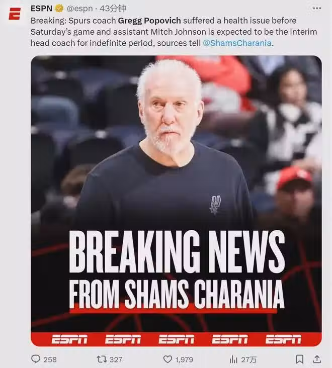 另據馬刺隊記Tom Orsborn跟進報道,波波維奇沒什麼大事,就是需要休息一段時間。波波維奇出生於1949年1月28日,再過倆月就要76歲了。2023年夏天,波波維奇5年8000萬美元跟馬刺續約,如今新合同剛剛開始執行,他的健康就出問題。