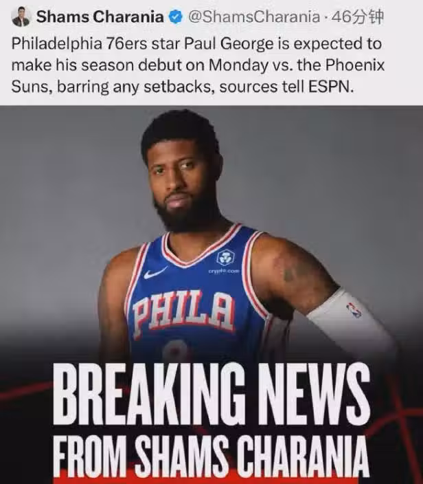Shams:喬治預計對陣太陽,上演本賽季&費城生涯首秀。