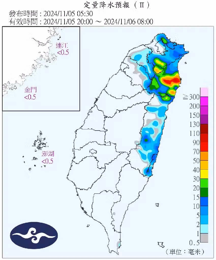 而周五,東北季風、颱風外圍雲系連番影響,北、東部將有短暫陣雨,局部大雨機率則出現在基隆北海岸、東北部、東部、大台北山區。