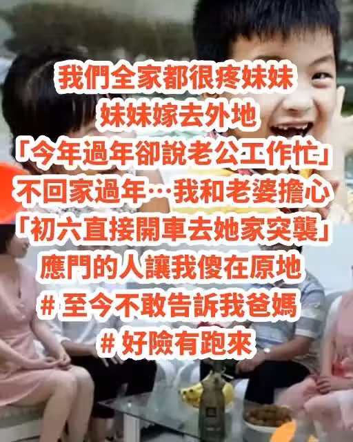 我們全家都很疼妹妹!妹妹嫁去外地「今年過年卻說老公工作忙」不回家過年…我和老婆擔心「初六直接開車去她家突襲」應門的人讓我傻在原地 # 至今不敢告訴我爸媽 # 好險有跑來~