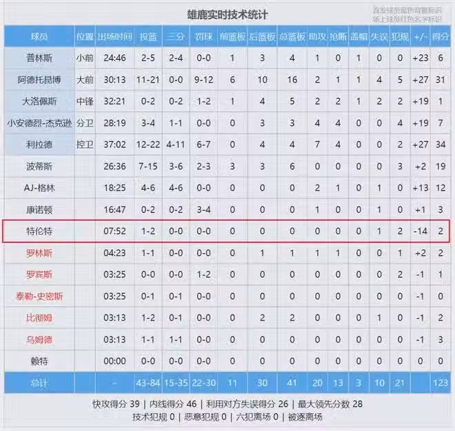 還記得小加里-特倫特嗎?雄鹿在休賽期的最強引援,本賽季卻徹底拉胯了!上一場雄鹿大勝爵士,特倫特的首發位置被小安德烈-傑克遜搶去了。特倫特此役僅打了8分鐘,2投1中得到2分0板0助1失誤2犯規,正負值-14,全隊最低。