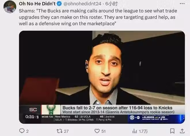 簡單概括一下:儘管最近圍繞字母哥的流言很多,但是目前字母哥沒有申請交易,雄鹿也沒打算交易他,雄鹿首選仍是給字母哥尋找幫手。Windhorst透露,雄鹿一直給別的球隊打電話,可是他們已經觸發了第二土豪線,也沒足夠的選秀權。