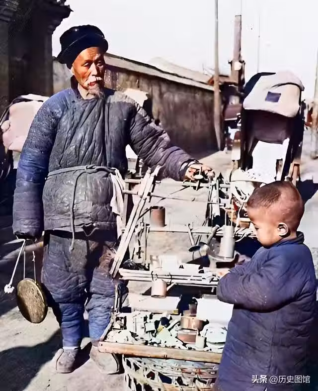30年代,河北保定街頭。一名老者正在擺攤,他賣的是兒童玩的各種小玩具。他一邊敲鑼,一邊吆喝。一個孩子被吸引了過來,站在攤位前挑選自己喜歡的玩具。看來,不論是過去還是現在,孩子們對玩具沒有一點抵抗力。