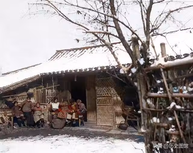 民國時期的一個冬季,房頂、樹木和地面上的積雪還沒有融化。幾名婦女坐在房檐下曬太陽。她們面前放著一個大鐵盆,裡面生著炭火。幾個人圍坐在一起烤火取暖。