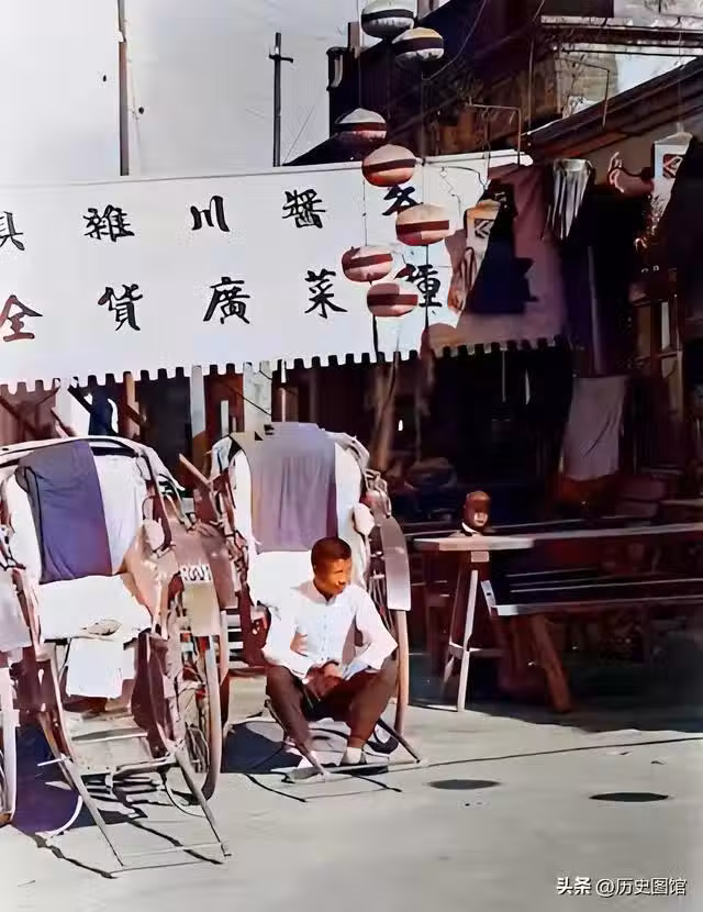 民國時期,四川街頭。一名黃包車師傅正在路邊等待乘客。這是一條繁華熱鬧的街道,路邊是一家售賣醬菜川廣雜貨店。每輛黃包車上都有編號,類似現在的計程車。雖然這份工作很辛苦,但也能養家餬口。