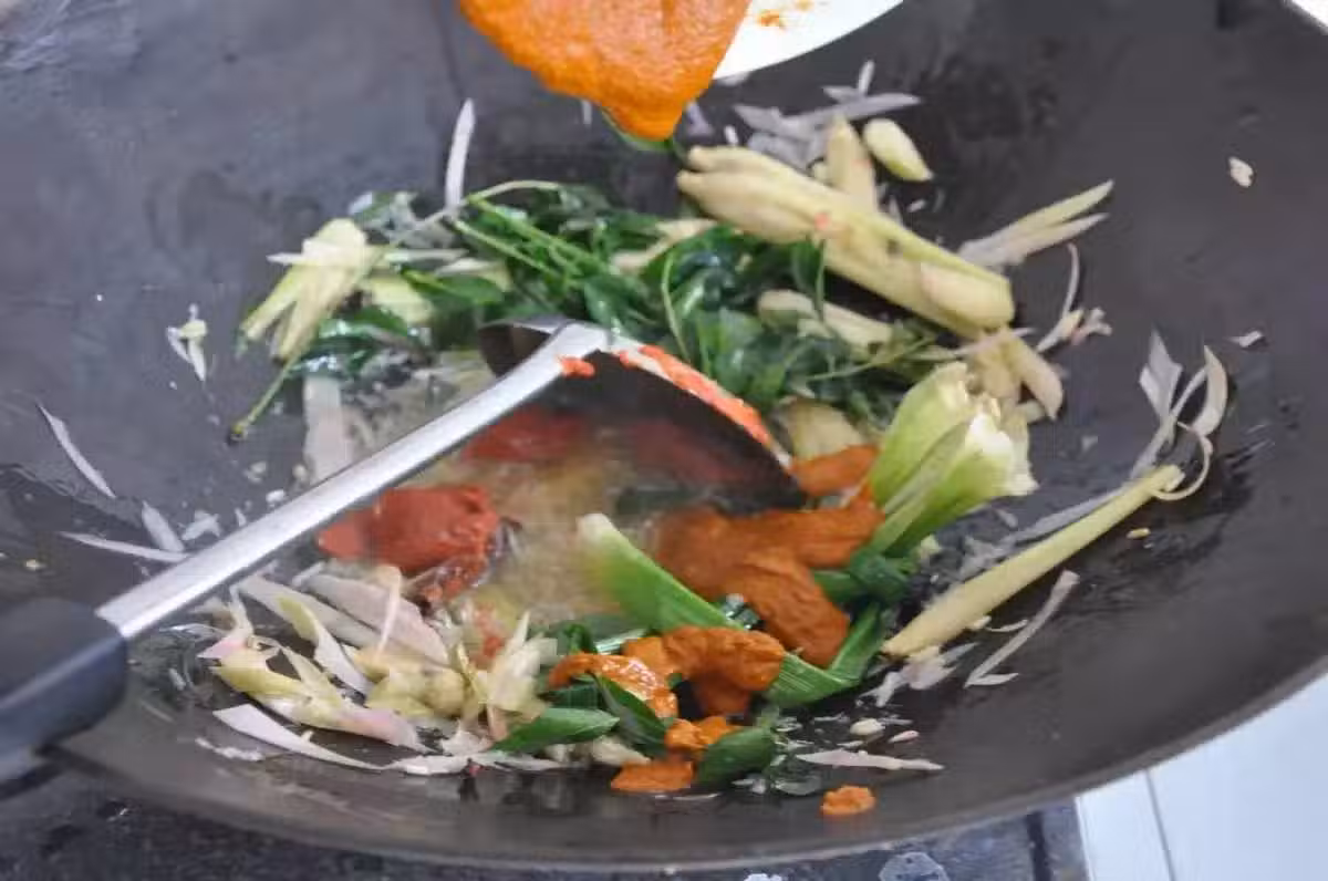 1. 熱鍋爆香——咖喱葉,香茅,黃姜,南姜以及辣椒碎。