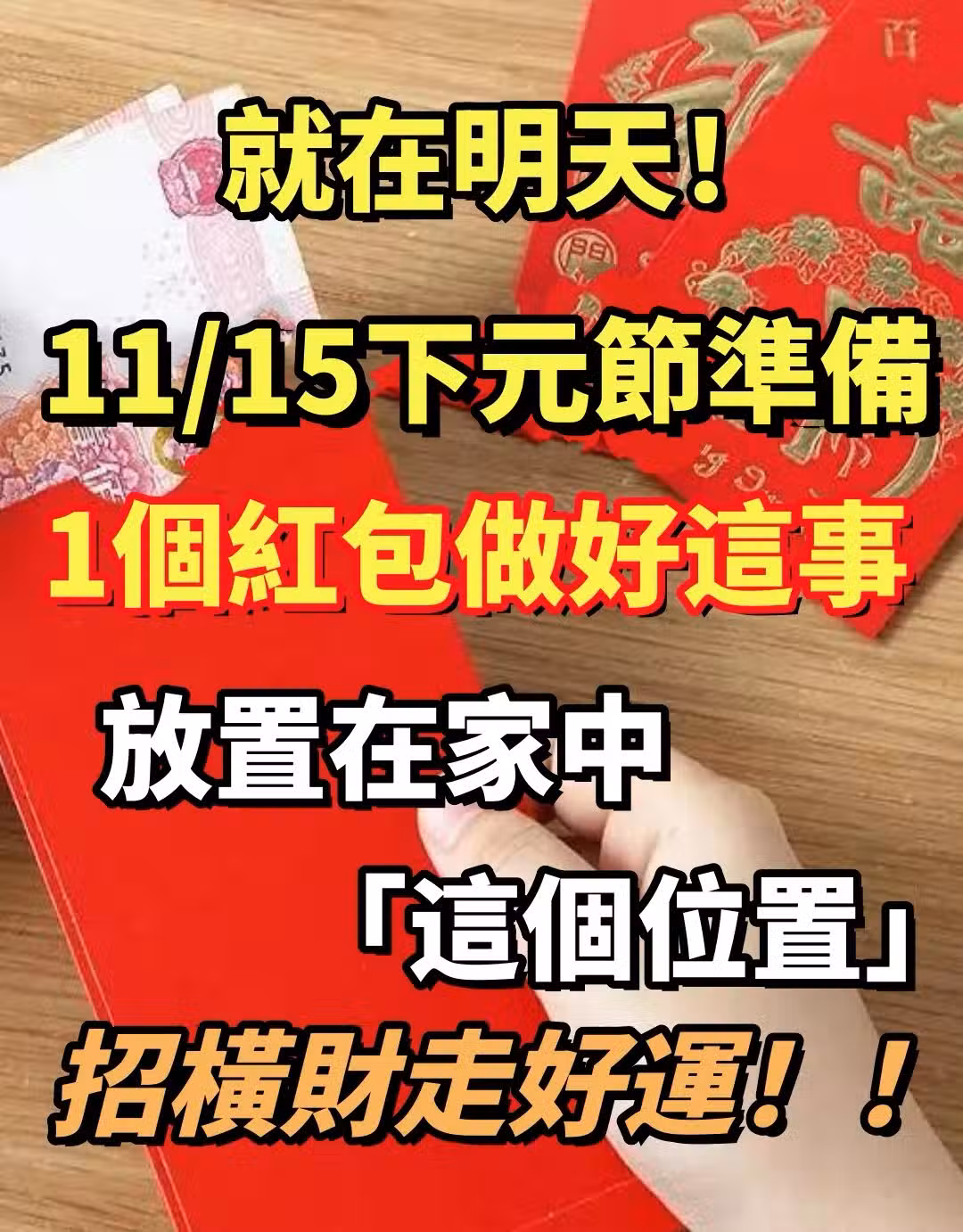 就在明天! 11/15下元節,準備「1個紅包做好這事」放置在家中這個位置,招橫財走好運!