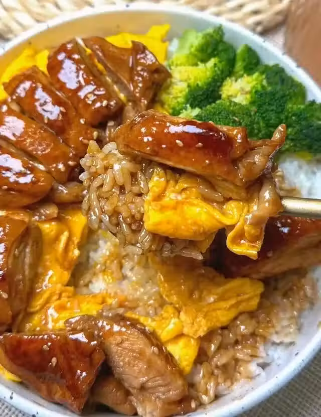 把滑蛋鋪在米飯上墊在雞腿下面,淋一些湯汁在米飯上拌勻吃~