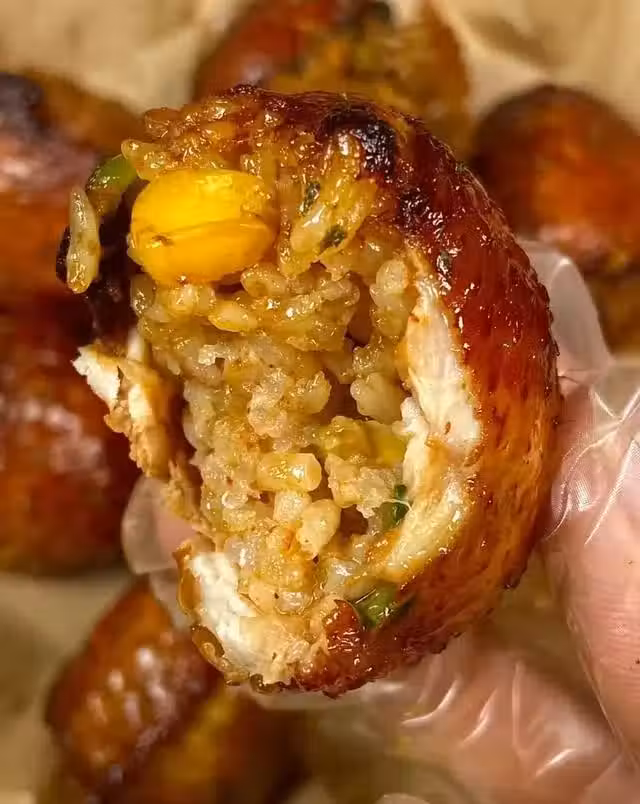 雞翅塞入米飯放空氣炸鍋刷腌制的醬汁,175度15分鐘,翻面再烤10分鐘即可~