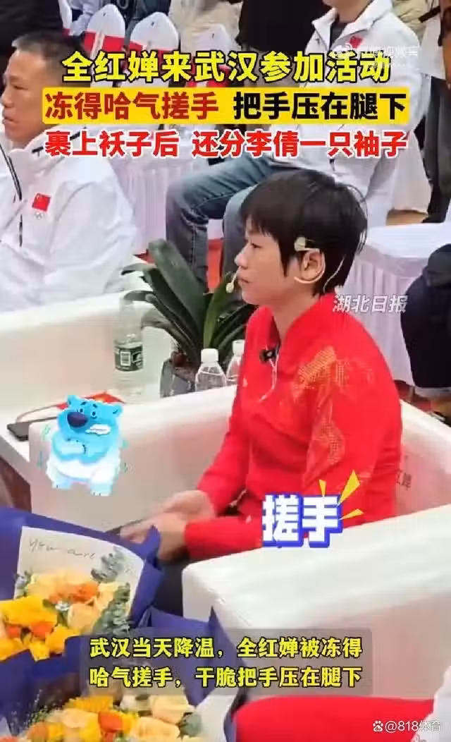 看到全紅嬋被武漢天氣凍到了,工作人員趕緊給她拿來了一件襖子,全紅嬋趕緊裹上,頓時感覺暖和多了。全紅嬋看到自己身旁的拳擊奧運冠軍李倩穿的也不多,看著也很冷,於是主動將棉襖的一個袖子分給了她,讓她也暖和暖和。