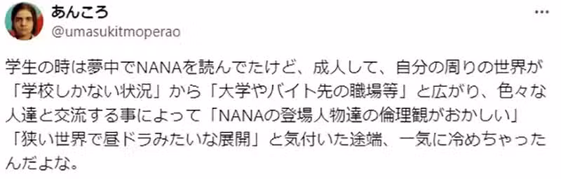 「這話題還真是令人懷念的漫畫啊……我身邊是沒有劈腿(章司)或是人間蒸發(美玲)或是懷了不是交往對象的人的孩子的人(伸夫哭哭),不過世上這類人還不少啊。我印象中雖然這部漫畫的確很有趣,但是真的有太多關於這類負面的描寫了。」