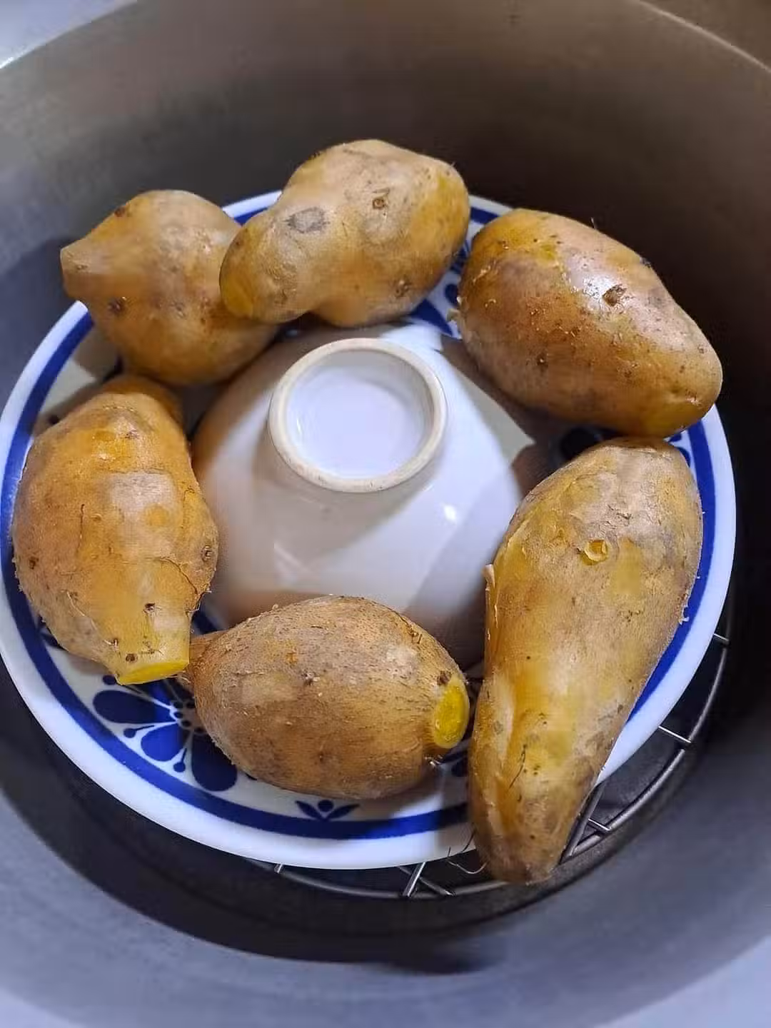 這一切的精妙之處在於「倒扣小碗」的細節。由於水分被集中在倒扣的小碗中,蒸煮後的地瓜表皮不會像傳統蒸煮方式那樣濕濕黏黏,反而更接近於烤地瓜的乾爽口感。