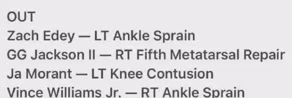 灰熊隊記Cole報道,莫蘭特因左膝挫傷,確定缺席接下來球隊主場迎戰活塞的比賽。
