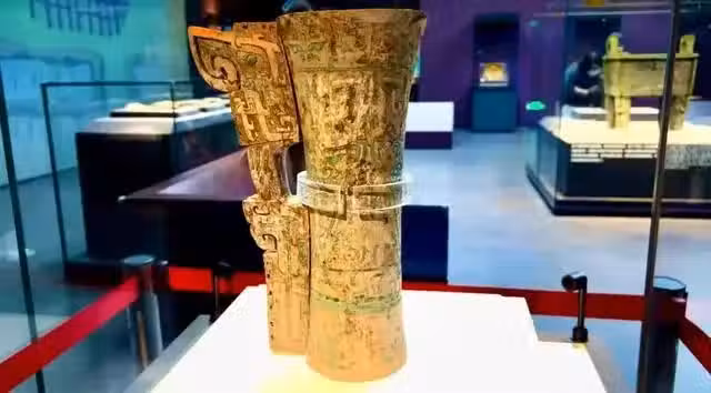 這是婦好的酒杯,杯身和手柄全部都用象牙雕刻而成,鑲榫連接,酒杯上面鑲嵌著綠寶石,花紋精細繁複,整體製作精緻,有30多厘米那麼高。
