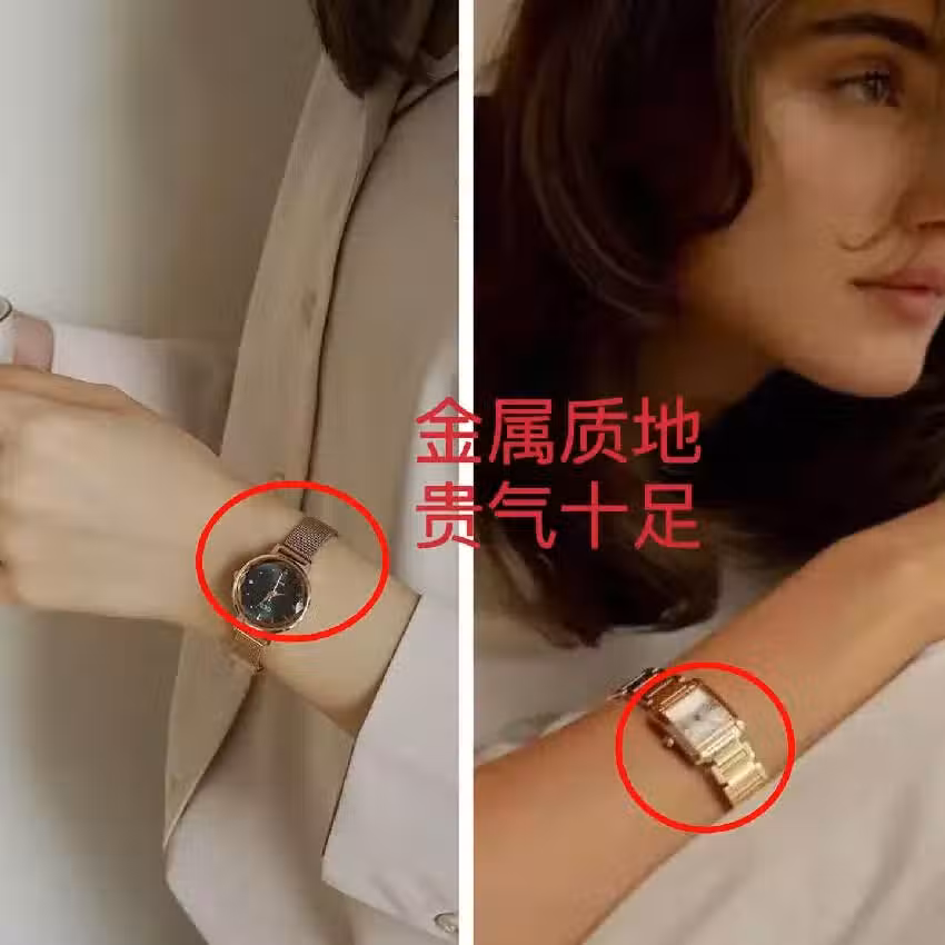 金屬質感的手錶能夠映襯膚色,使其手腕看起來白皙透亮,獨有的光澤感又能為中年女人的穿搭增添層次感;