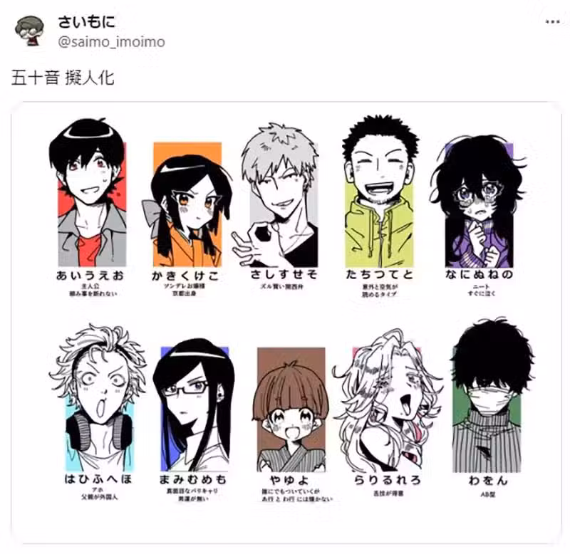 這位暱稱「さいもに」的繪師,最近發表了上面這一張,將日文假名(五十音)依照各行分門別類,進行擬人化的創作。隨即引爆了上萬網友的轉發、按贊的熱烈反響。大家都紛紛討論起,這些人物符不符和自己對於日文假名(五十音)的印象!