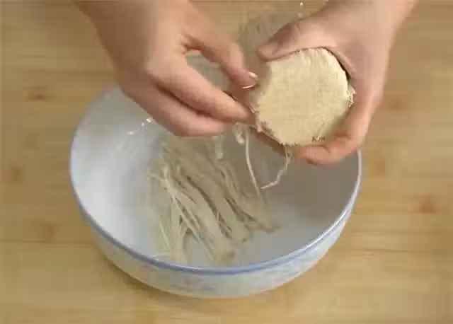3.一把金針菇把根部去掉,再撕成小朵。