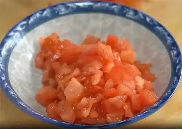 5.燙好的西紅柿把皮去掉,再切成丁。