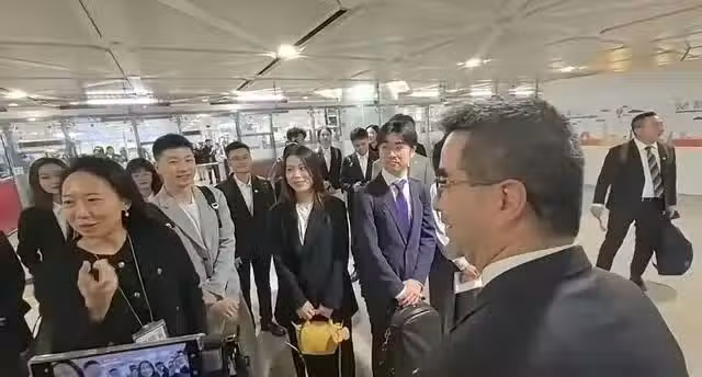 當所有人員到齊後,引導員帶領著40名師生進行統一出行。每位學生都攜帶了自己的背包和行李箱。馬龍攜帶了一個黑色的大行李箱,而楊倩則帶著更多的物品,其中包括一個黃色的小箱子和一個粉色的大行李箱。