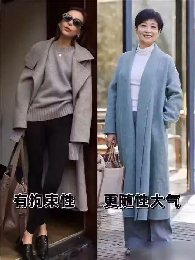 而如果這時候搭配一雙長筒靴,下裝厚度就會增加,整體量感就平衡了。而穿長款外套的時候,如果褲子/裙子寬大,就不能太長,露出腳踝,人才顯得纖細。