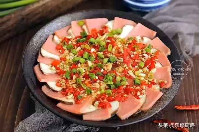 第一步:準備食材。杏鮑菇2-3根、午餐肉或者三明治火腿半塊,剁辣椒適量、蒜適量、香蔥適量。