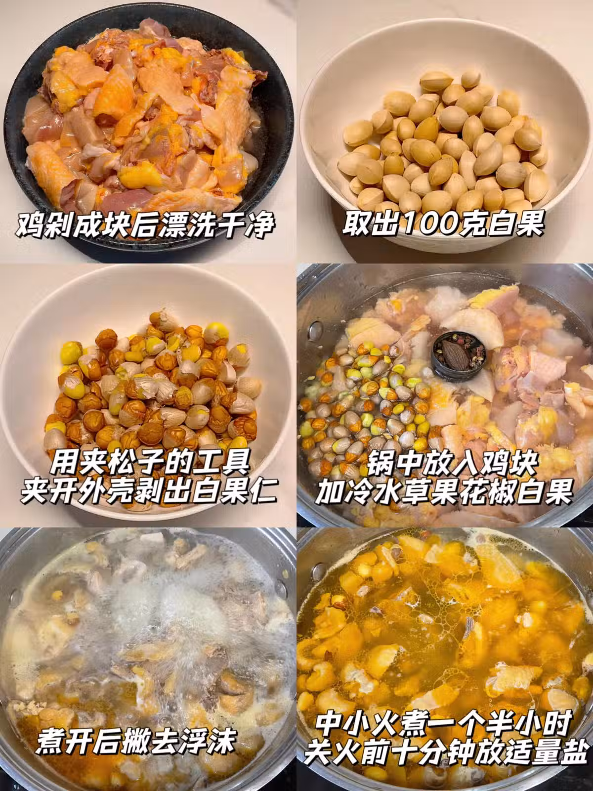 剁成塊漂洗乾淨後放入鍋中,再加入一個草果、十幾粒花椒、一塊姜塊和準備好的白果仁,並加入沒過食材的冷水,煮開後撇去浮末,再加入適量食鹽(⚠️鹽的量比平時單獨燉肉要稍稍少一點,才能更好突出鮮甜味),合上蓋子,中火煮一個半小時左右,白果已經比較扒軟了,香香的糯糯的,口感特別好,雞肉雞湯的香味也更加突出,滿屋飄香,還沒吃就陶醉了,這兩種食材的搭配非常妙,可謂是相得益彰,無論從營養的角度還是味覺感知的角度,都更加呢板扎👍👍