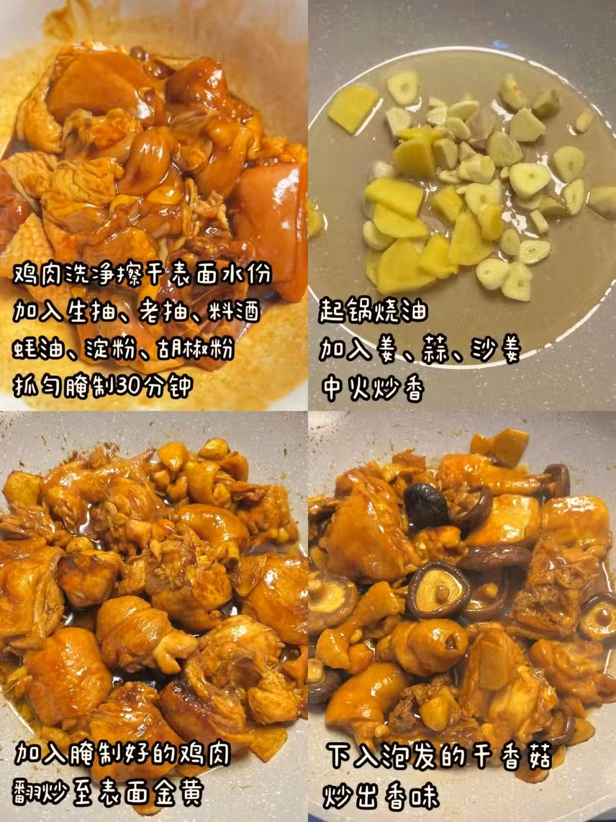 三黃雞、干香菇、姜、蒜、沙姜、蔥、生抽、老抽、蚝油、料酒、澱粉、鹽、雞精、白砂糖、胡椒粉、食用油