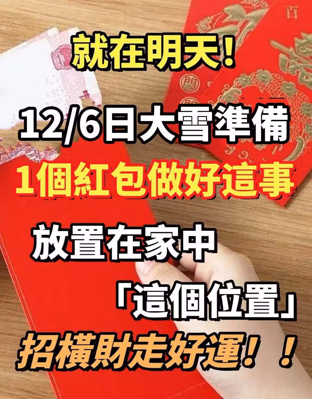 就在明天! 12/6日大雪,準備「1個紅包做好這事」放置在家中這個位置,招橫財走好運!