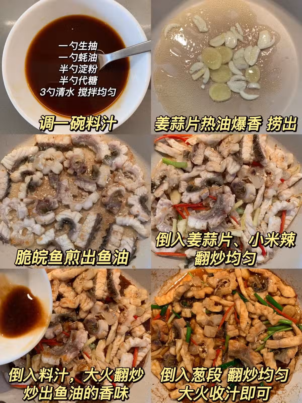 ✔️熱油倒入蒜薑片爆香,撈出蒜薑片。倒入脆皖魚,煎出魚油。倒入蒜薑片,小米辣翻炒均勻。