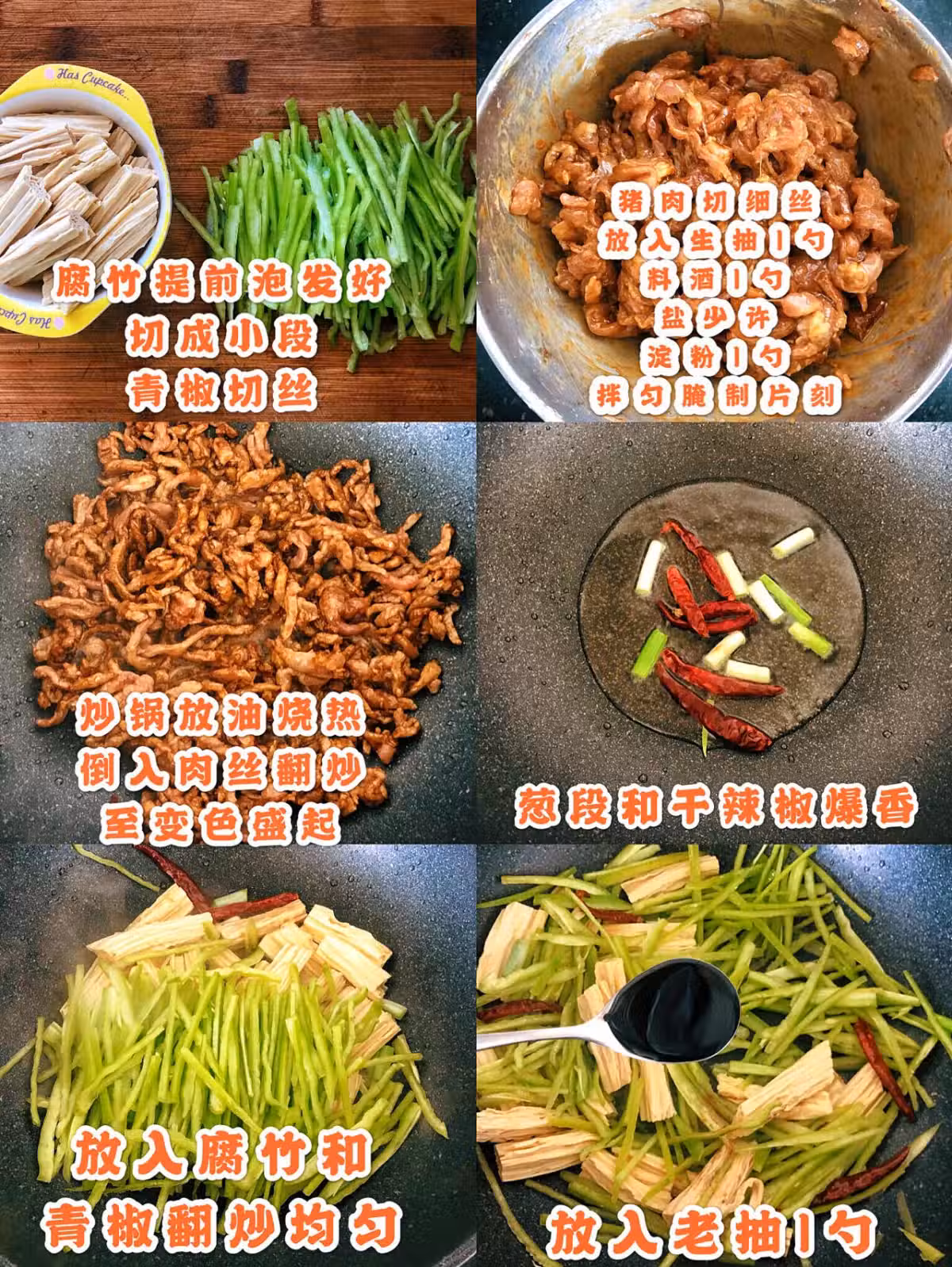 ✅腐竹提前泡發好切成小段,青椒切絲。豬肉切細絲放入生抽1勺、料酒1勺、鹽少許、澱粉1勺拌勻腌製片刻。
