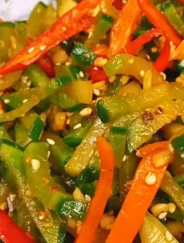 6、將炸好的花椒油倒入蘿蔔條內,再加鹽+醬油+辣椒油+白糖,翻拌均勻,放在保鮮盒內,放置一晚就可以吃了。
