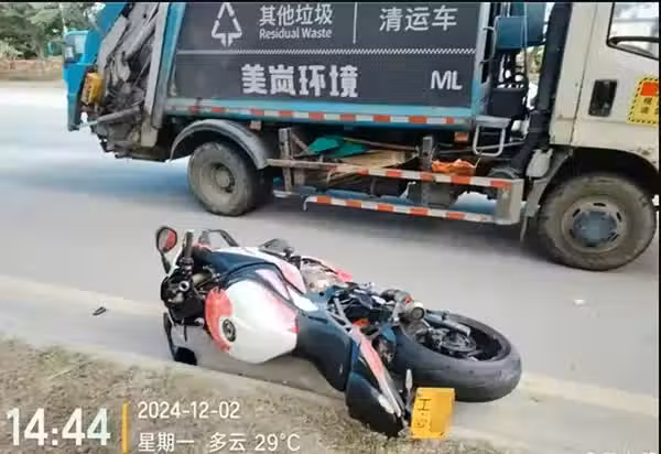 萬小橘的摩托車就摔倒在路邊,旁邊停著一輛垃圾清運車,不知道萬小橘是不是撞到了這輛車。