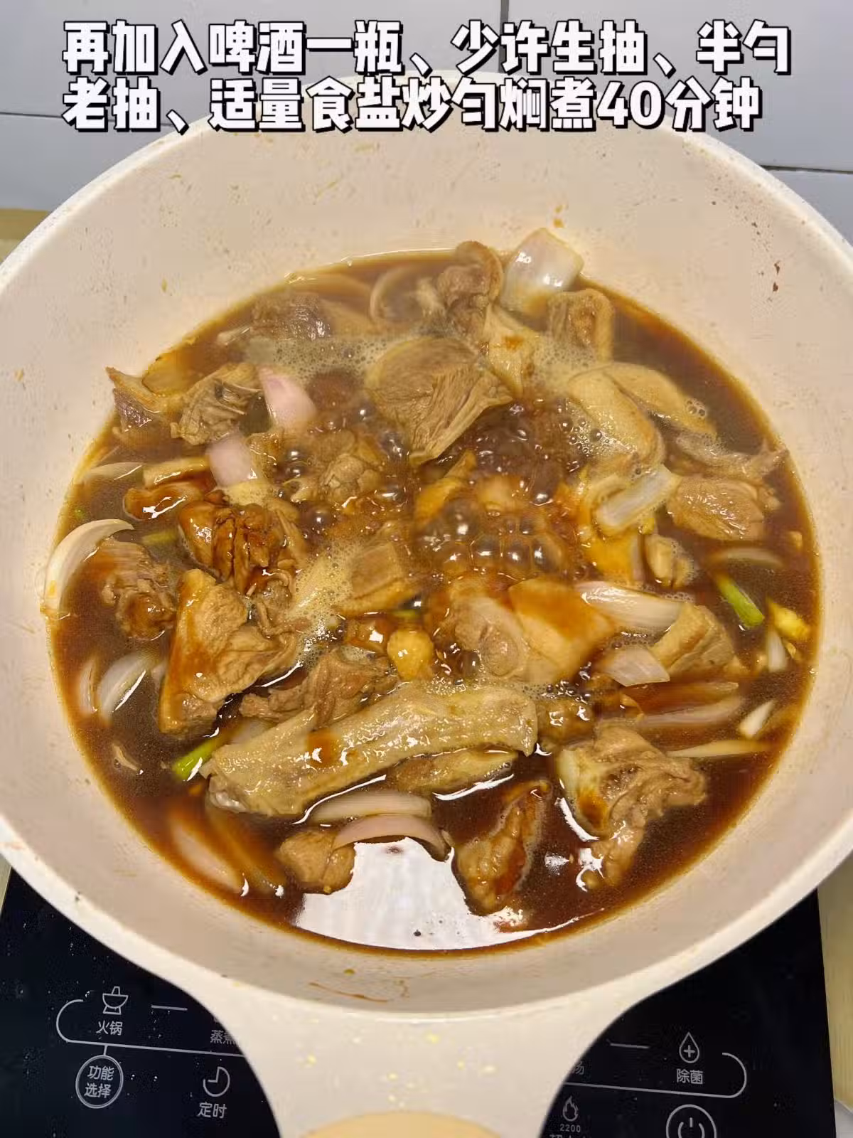 ②放洋蔥、薑絲、炒香,放鴨肉翻炒片刻,再加入啤酒一瓶、少許生抽、半勺老油、適量食鹽炒勻燜煮40分鐘