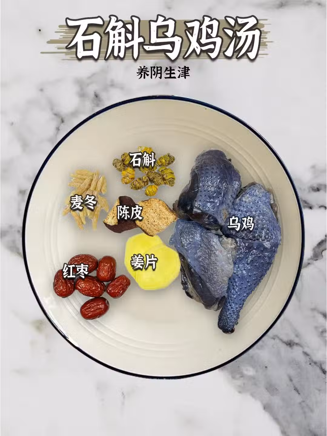 食材:烏雞 石斛 麥冬 薑片 陳皮 紅棗