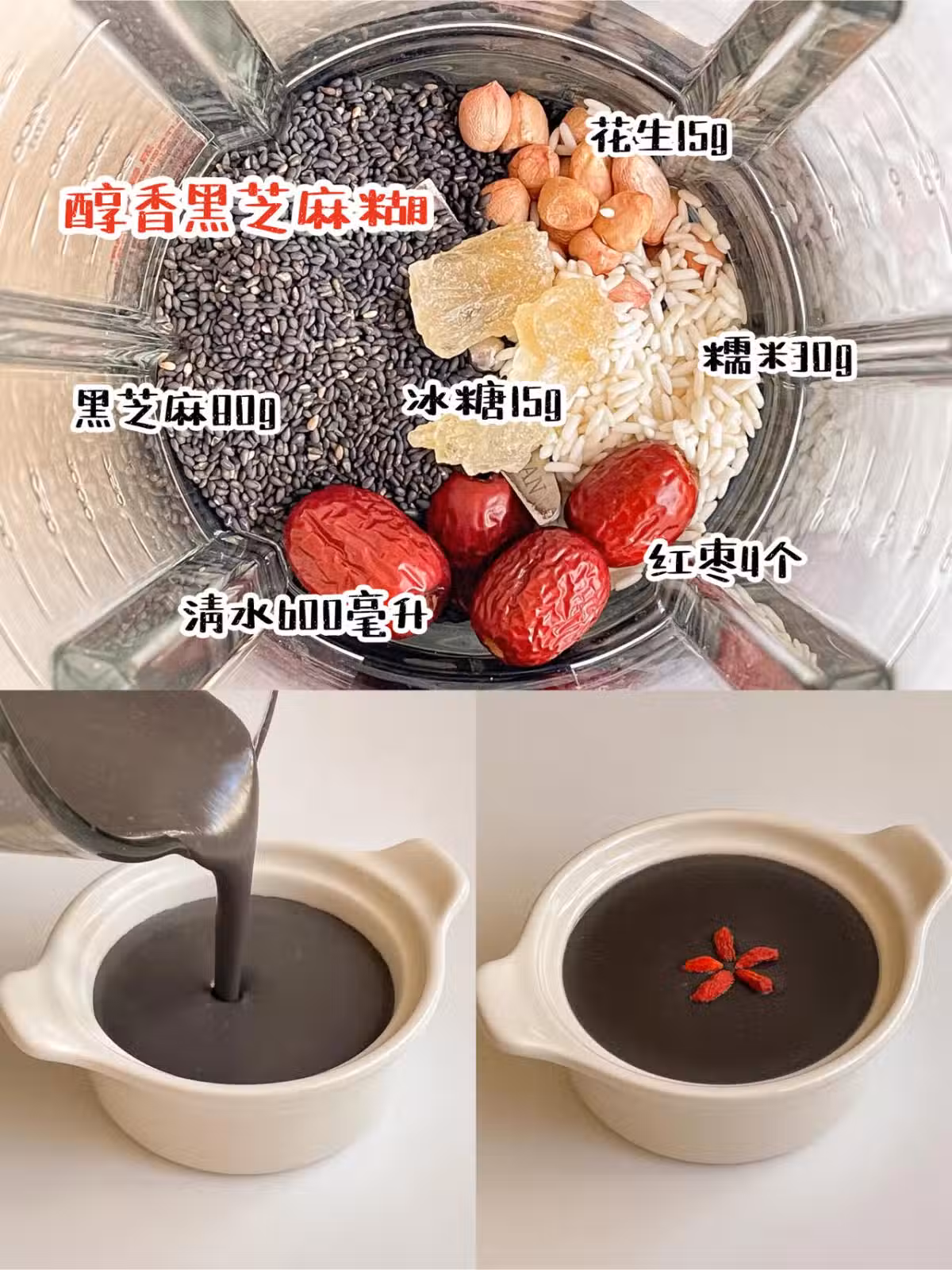 🥤醇香黑芝麻糊 黑芝麻80g|花生15g|糯米30g|紅棗4顆|冰糖15g|清水600 枸杞(裝飾用) ◆養發星人超愛這一碗。芝麻香香氣四溢,濃稠綿密,細膩順滑。~~~~~~~~~~~~~~~~~~~~~~~~~~~~~~~~~~~