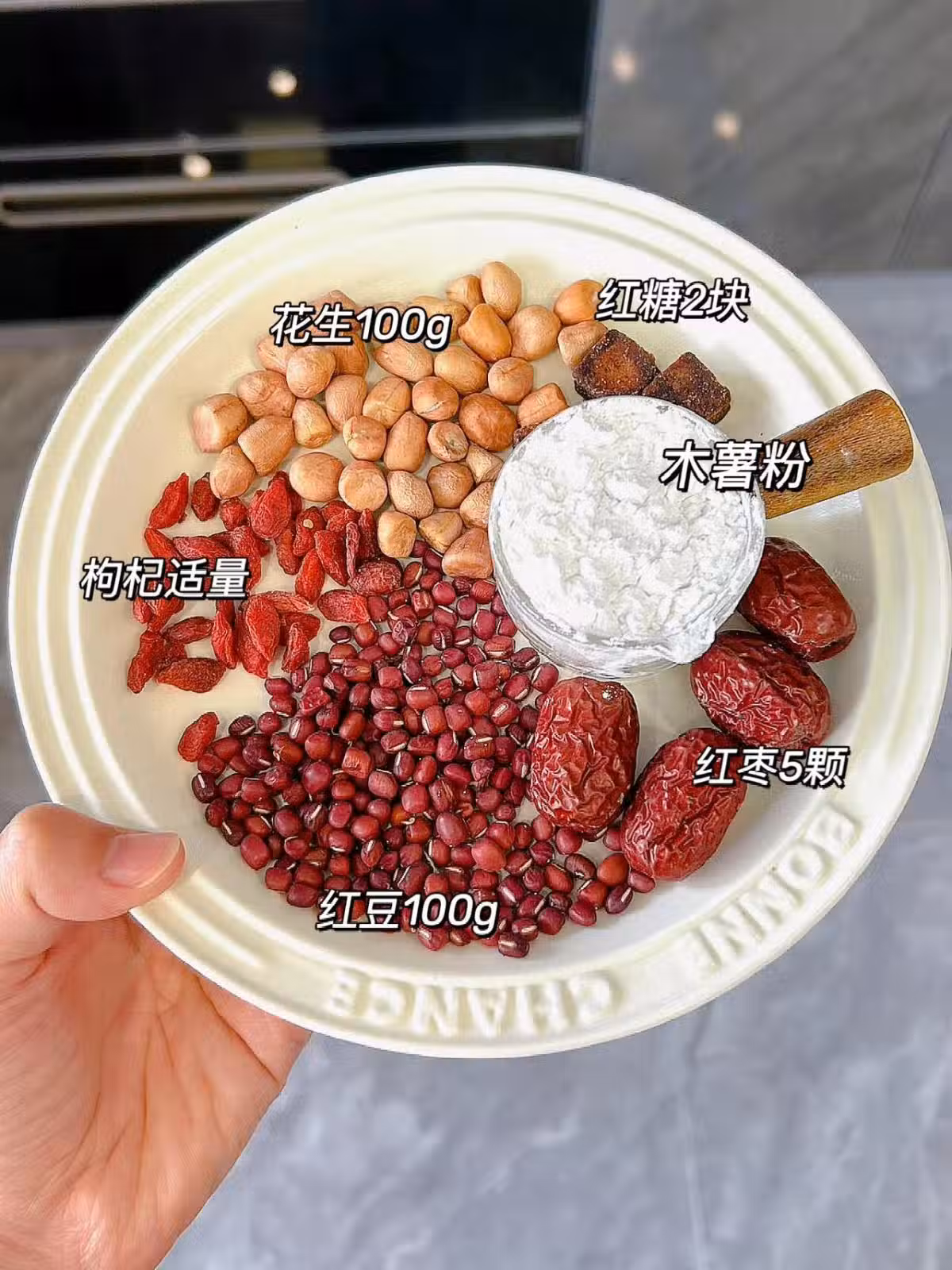 食材:花生100g,紅糖2塊,木薯粉1杯,枸杞適量,紅豆100g,紅棗5粒