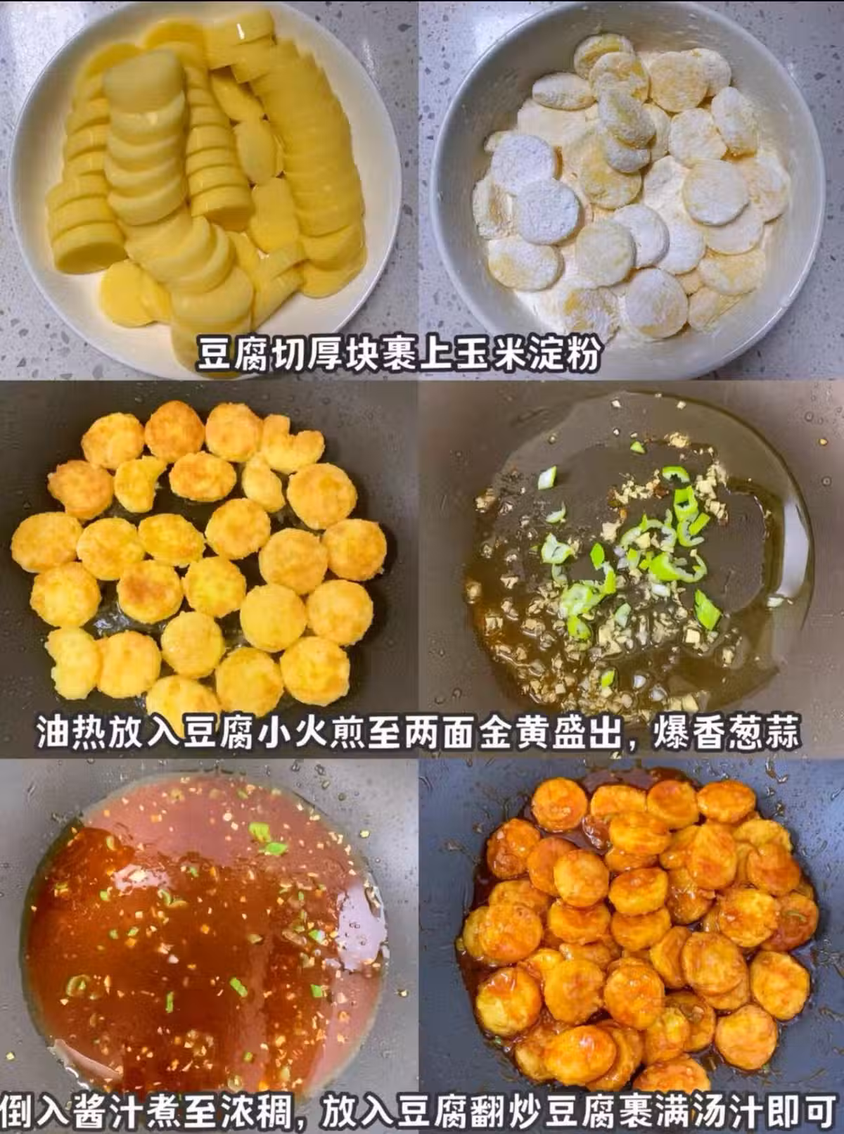 做法:豆腐切厚塊裹上玉米澱粉,油熱放入豆腐小火煎至兩面金黃盛出, 爆香蔥蒜到入醬汁煮至濃稠, 放入豆腐翻炒豆腐裹滿湯汁即可