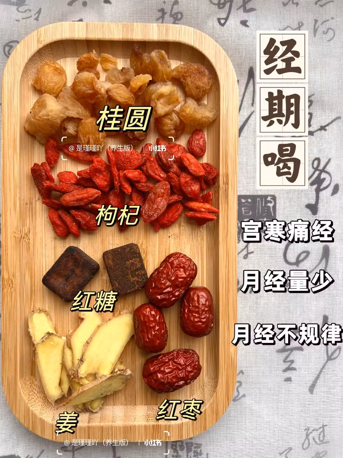 ❤️經期時:桂圓、紅枸杞、薑絲、紅棗、紅糖。