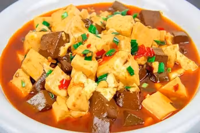 3.鍋內燒油,放入蒜末和蔥花爆香,加入豆瓣醬10克炒出紅油,放入適量的清水沒過豆腐和豬血,加入老抽提色、生抽鮮味、十三香2克、胡椒粉2克、食鹽2克、雞粉2克,少許白糖提鮮,開大火收汁。4.湯汁收濃以後撒上韭菜花、淋上花椒油,美味即成。
