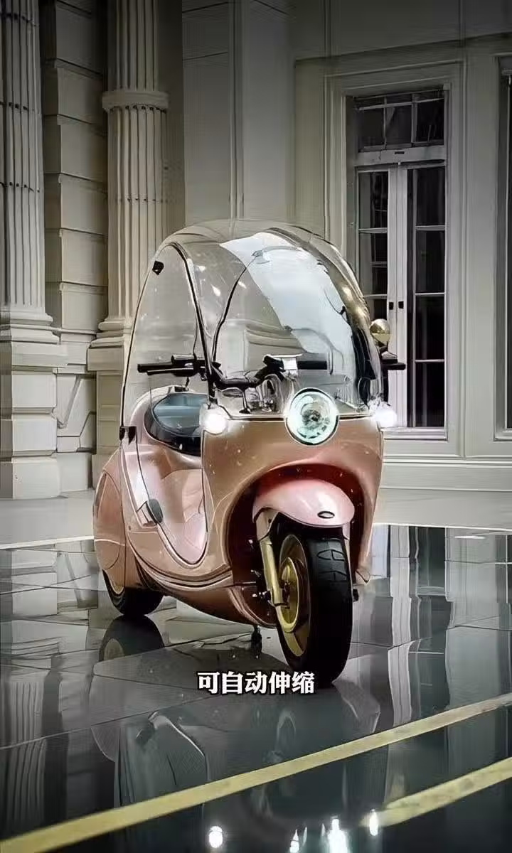 新一代三輪摩托車,外觀設計獨特,可自動伸縮,全透明車體遮風擋雨,前輪自平衡怎麼騎都不倒