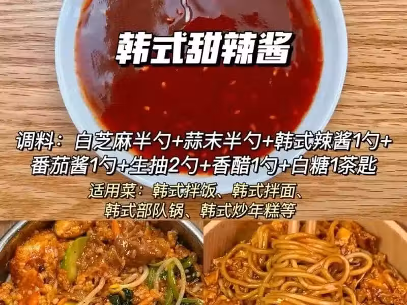 配比:白芝麻半勺、蒜末半勺、韓式辣醬1勺、番茄醬1勺、生抽2勺、香醋1勺、白糖1茶匙。 韓式甜辣醬融合了多種口味,既甜又辣,還帶有一絲酸香。用它來拌飯或拌面,都能讓你感受到濃郁的異國風情。適用於韓式拌飯、韓式拌面、韓式部隊鍋、韓式炒年糕等。這種醬汁的甜辣味道和濃郁的色澤,能為這些韓式料理增添獨特的風味。