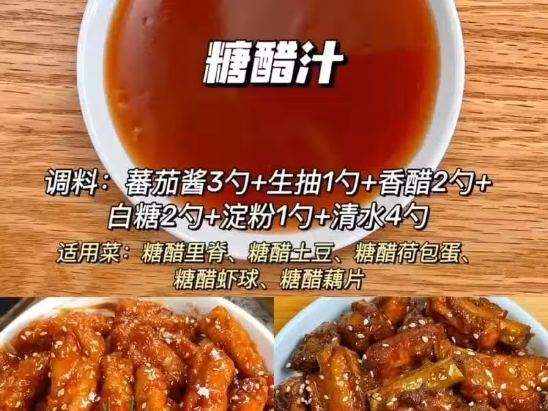 配比:番茄醬3勺、生抽1勺、香醋2勺、白糖2勺、澱粉1勺、清水4勺。 糖醋汁酸甜可口,色澤鮮亮。將裡脊肉或土豆炸至金黃後,淋上這款醬汁,即可品嘗到美味的糖醋菜肴。適用於糖醋裡脊、糖醋土豆、糖醋荷包蛋、糖醋蝦球、糖醋藕片等。糖醋汁的酸甜口感和鮮亮色澤,能為這些糖醋類菜肴帶來更加誘人的風味。