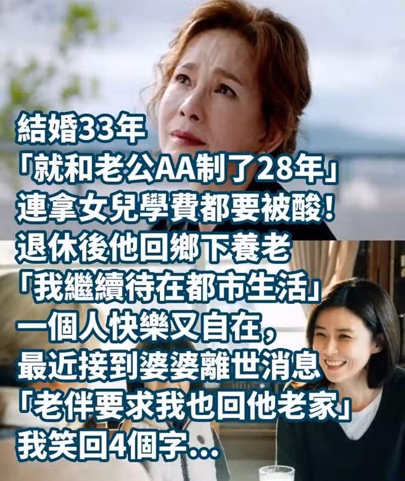 結婚33年「就和老公AA制了28年」連拿女兒學費都要被酸! 退休後他回鄉下養老「我繼續待在都市生活」一個人快樂又自在,最近接到婆婆離世消息「老伴要求我也回他老家」我笑回4個字...