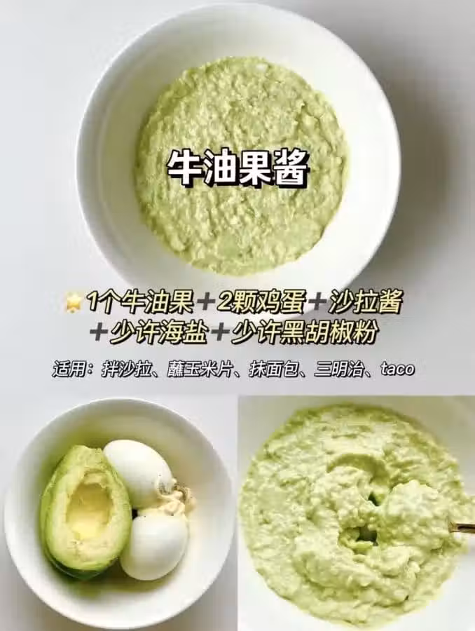 1個牛油果+2顆雞蛋+沙拉醬+少許海鹽+少許黑胡椒粉