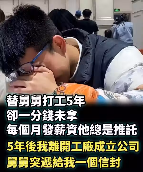 替舅舅打工5年,卻一分錢未拿,每個月發薪資他總是推託,5年後我離開工廠成立公司,舅舅突遞給我一個信封~