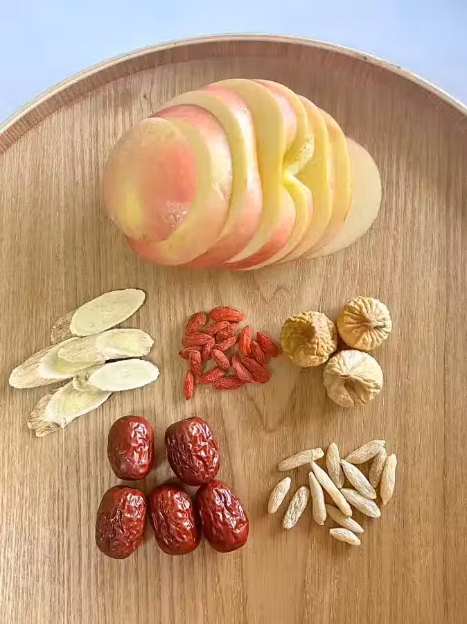 準備食材:蘋果一整個去核、黃芪五片、枸杞18粒、紅棗5顆、麥冬13粒、無花果3顆!