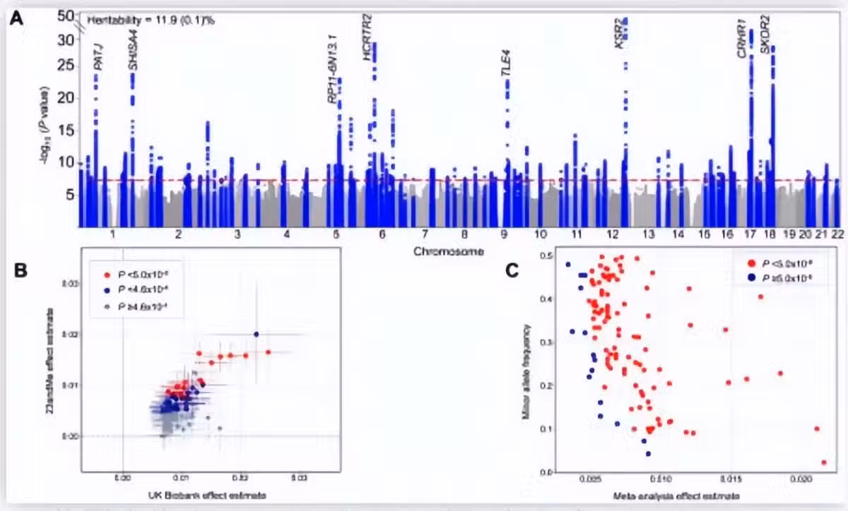 為了確定可能引起白天午睡和睡眠喚醒生物學的因果變異體,研究人員對試驗參與者的6個睡眠特徵(嗜睡,睡眠持續時間,失眠,打鼾、睡眠類型以及易醒)進行了分析,最終確定了33個與其他睡眠類型共享的信號。