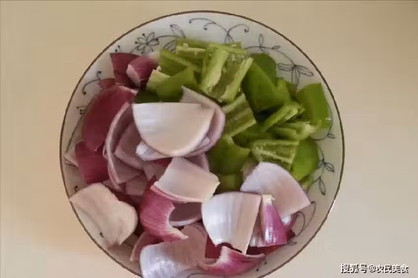 首先將馬鈴薯切成薄片,洋蔥和青椒切成絲狀備用。