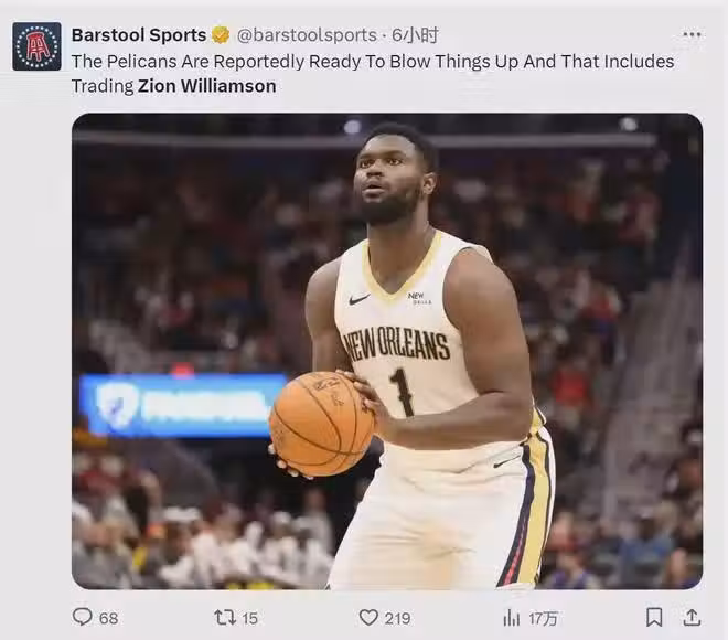 ESPN薪資專家Bobby Marks表示,錫安已經進入交易市場,勇士是他的潛在下家。錫安合同5年1.93億美元,2028年夏天才能到期,聽起來沒有交易價值。但是,由於錫安出場次數不夠,他最後兩年8700萬美元的薪水是完全無保障。
