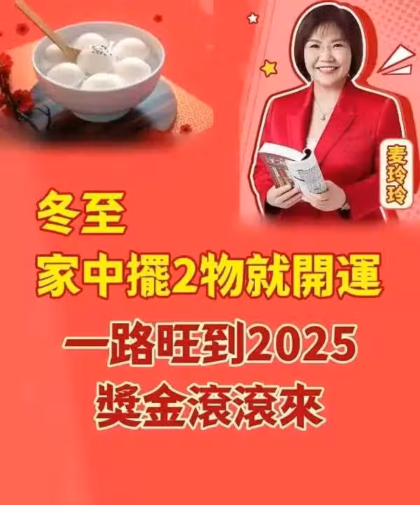 冬至「家中擺2物」就開運!一路旺到2025,獎金滾滾來 今年的冬至落在12月21日,冬至是北半球一年中白天最短的日子,在二十四節氣中也象徵期待秋收冬藏,過去人們會在此時節休養進補恢復生息,並準備過年的物品,民間多半會在冬至吃湯圓,求個圓滿、豐碩的好兆頭。